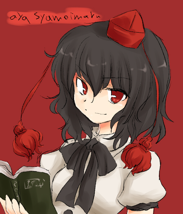1girlblack haircharacter namefemale focushatlooking at viewernotebookpom pom (clothes)red backgroundred eyessimple backgroundsmilesolotokin hatwavy hair