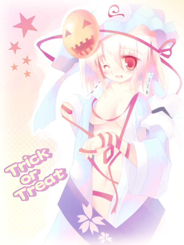 1girlblonde hairenglish textfemale focushalloweenjack-o'-lanternmaskmidriffnaked ribbonno brano pantiespumpkinribbonshort hairsolotrick or treat