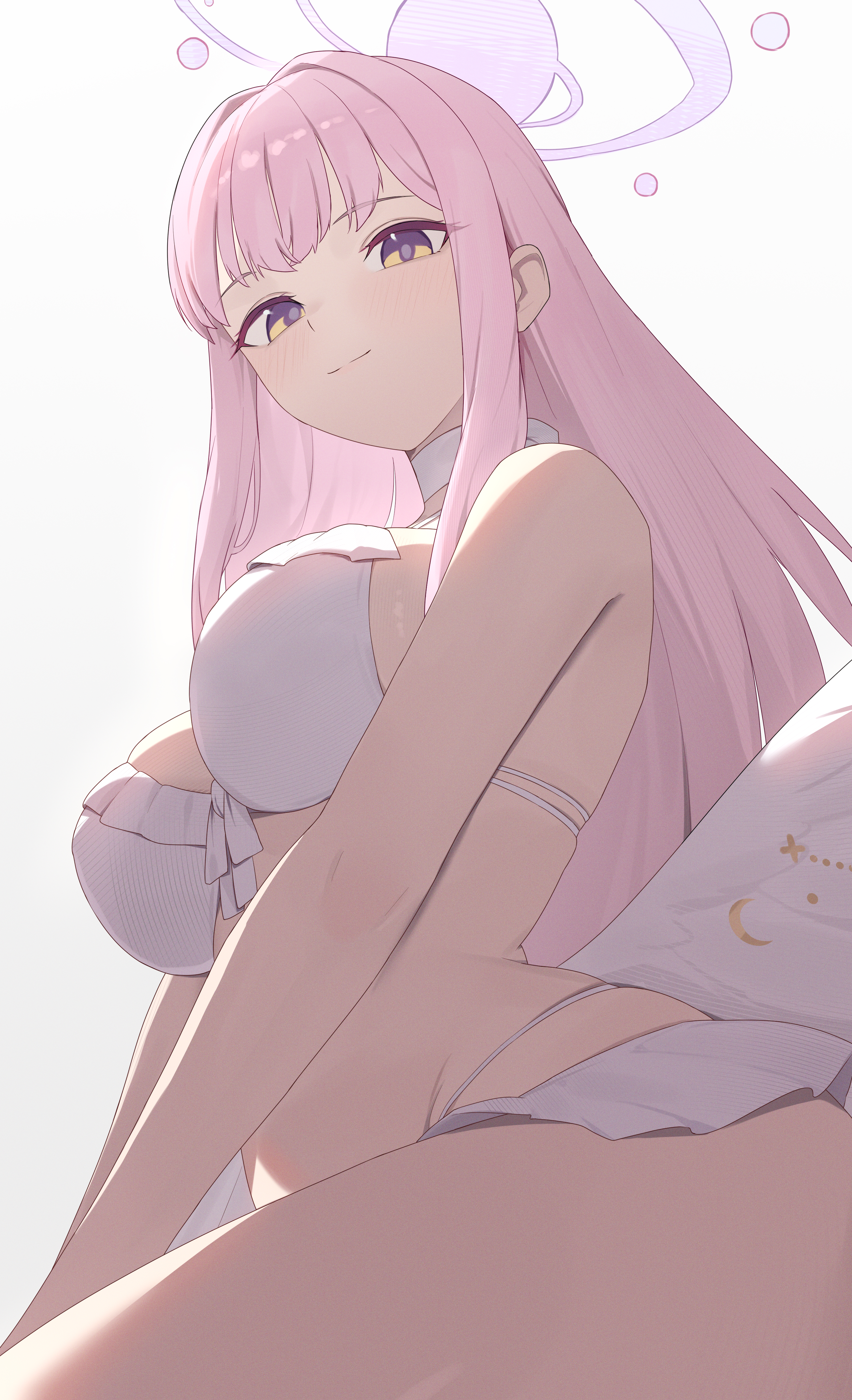 1girlangel wingsbikinibreastschokerclosed mouthfeathered wingsfrilled bikinifrillsfrom belowhair intakeshalolarge breastslong hairlooking at viewerlow wingsmulticolored eyesofficial alternate hairstylepink halosimple backgroundsmilesoloswimsuitthighswhite backgroundwhite bikiniwhite chokerwhite wingswing ornamentwingsyellow eyes