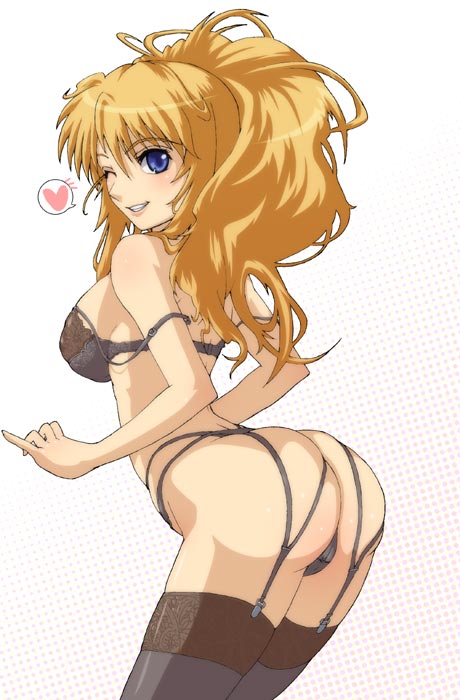 1girlarched backassblonde hairblue eyesbrafemale focusheartlingerieone eye closedpantiesskindentationsolostrap slipthighhighsunderwearunderwear onlywink