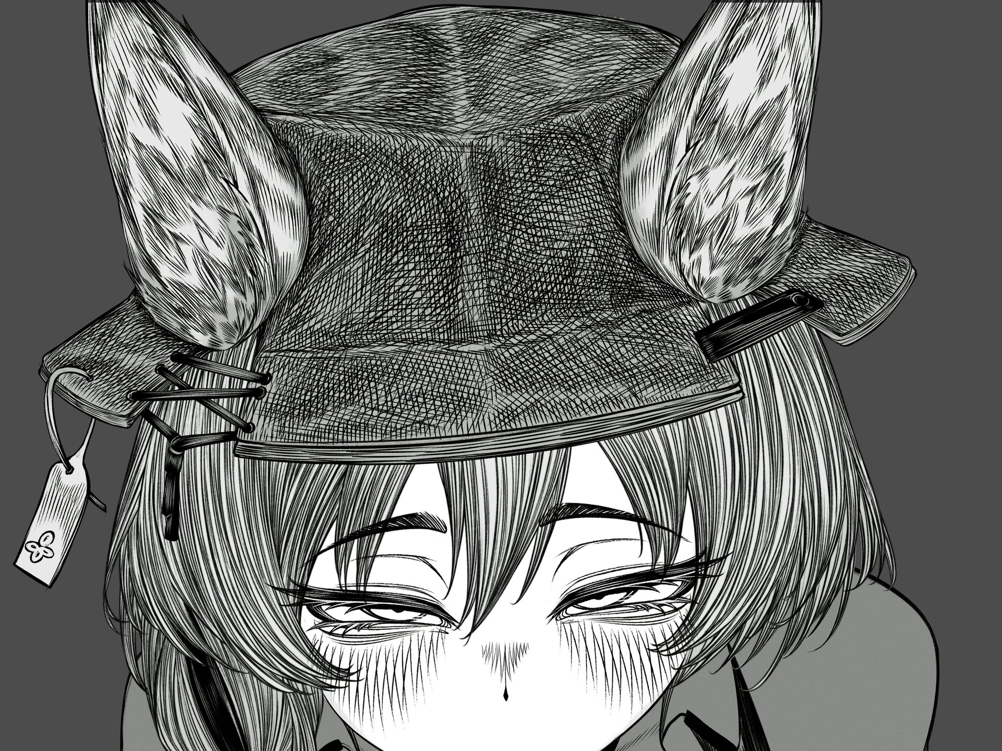 1girlanimal ear fluffanimal earsblushbraidears through headweargreyscalehair between eyeshathyena earshyena girlimplied fellatiolong hairlooking at viewermonochromeout-of-frame censoringpovribbonsimple backgroundsingle braidsolo