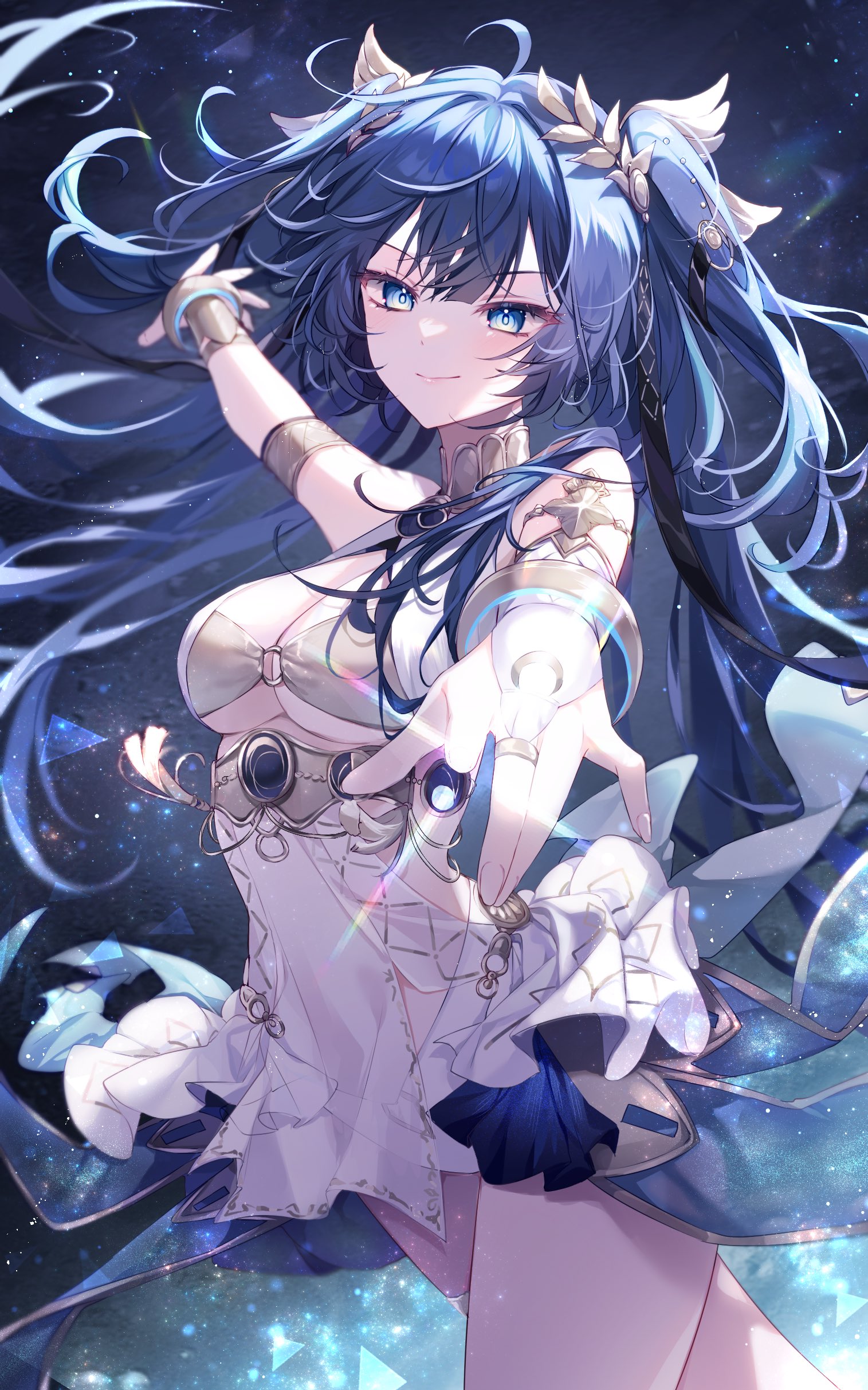 1girlahogeancient greek clothesarmletbare shouldersblack skirtblue eyesblue hairblushbreastsbridal gauntletscleavageclosed mouthgold bragreco-roman clotheshair belthead wreathjewelrylong hairlooking at viewermedium breastsoutstretched armshowgirl skirtskirtsmilesolothighstwintailsvery long hairwhite bridal gauntlets