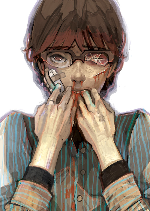 androgynousbandagesbloodblood from mouthblood on clothesblood on faceblousecutsglassesinjuryshirtsimple backgroundsolostriped clothesstriped shirtwhite background