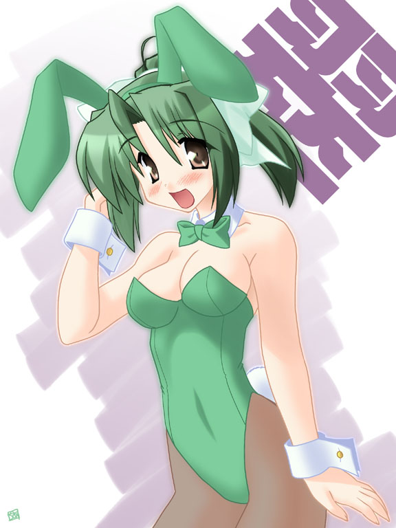 1girlanimal earsblushbrown pantyhosefake animal earsfemale focusgreen hairleotardpantyhoseplayboy bunnyrabbit earssolo