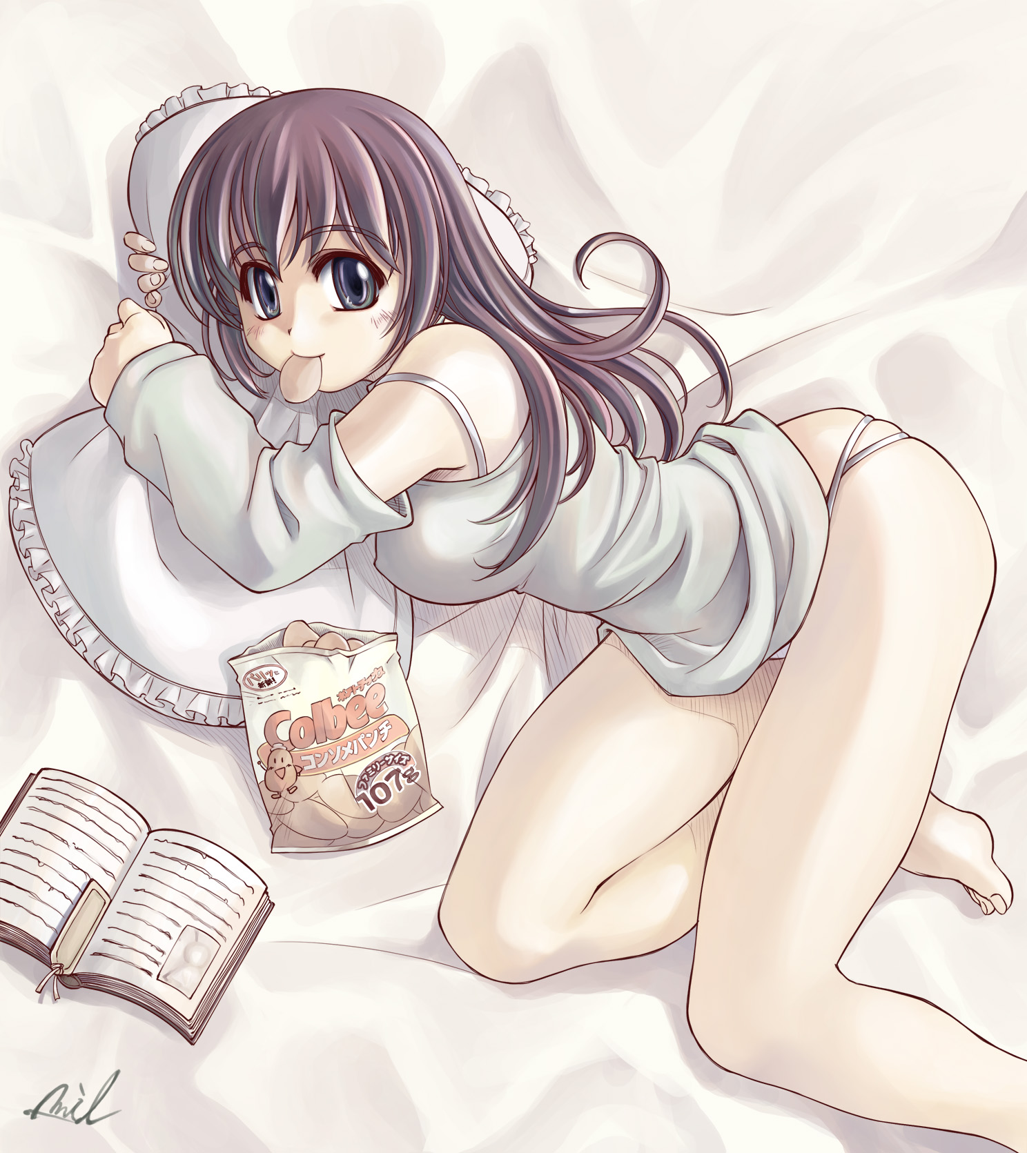 1girlbarefootbedblue eyesblushbookbookmarkbrabreastscamisolechips (food)covered erect nipplesdetached sleevesfeetfemale focusfoodfrilled pillowfrillsfrom abovehugging objectlegslingerielong hairlyingmedium breastsmouth holdno pantson sidepantiespillowpillow hugpotato chipspurple hairsignaturesolothongunderwearwhite panties