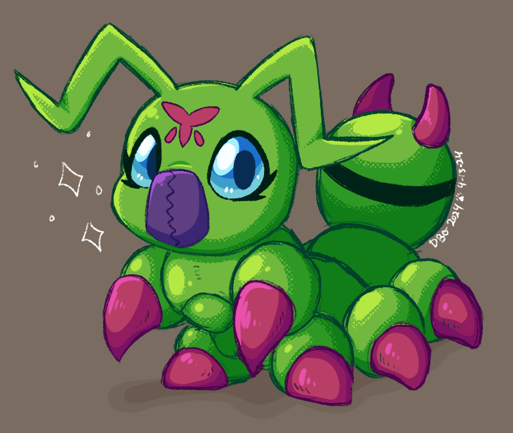 antennaeblue eyesbrown backgrounddigimon (creature)dreamyboogremlooking at viewerno humanssimple backgroundsolosparkle
