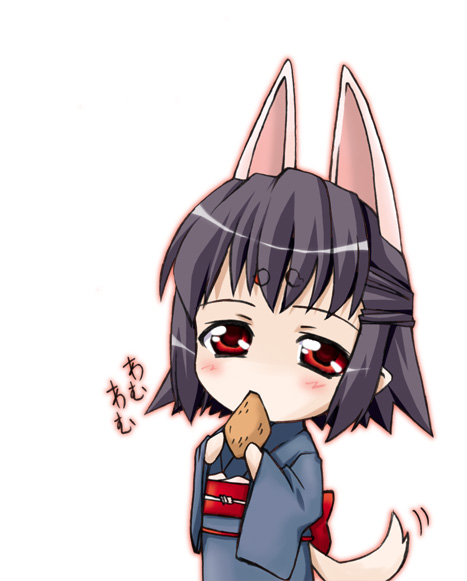 1girlanimal earsblack hairblushchibichibi onlyeatingfemale focusfox earsjapanese clotheskimonopointy earsred eyesshort hairsimple backgroundsolotailwhite background