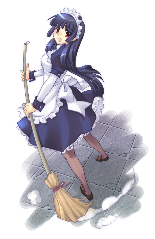 1girlapronblue hairblunt bangsblushbroombrown pantyhosebrown shoescrackcracked floorfemale focusfloorfrom abovefull bodylayered sleeveslegs apartlong hairlong sleeveslooking at viewermaidmaid apronmaid headdressmary janesopen mouthpantyhosered eyesshoesshort over long sleevesshort sleevessolostandingwhite background
