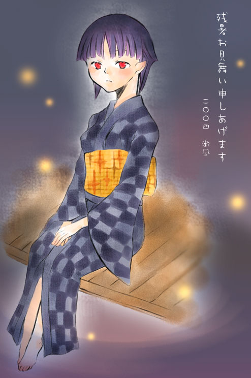 00s1girlbarefootblunt bangsblushbob cutfemale focusfrownjapanese clotheskimonopurple hairred eyesshort hairsidelockssittingsolo