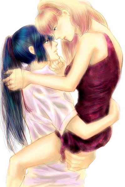 00s1boy1girlbare shouldersblonde hairblue hairdressfrom sidelong hairon personponytailprofilered dresssimple backgroundsittingwhite backgroundwhite dress