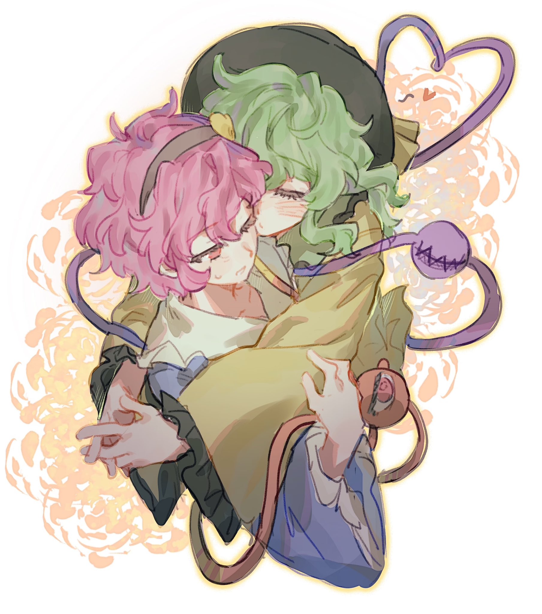 2girlsblack hairbandblue shirtclosed eyescropped torsoeyeballfloral backgroundfrom abovegreen hairhair ornamenthairbandhatheartheart hair ornamentheart of stringhuglong hairlong sleevesmessy hairmultiple girlsone eye closedpink eyespink hairshirtsiblingssimple backgroundsistersthird eyeupper bodywhite backgroundwide sleevesyellow shirtyuri