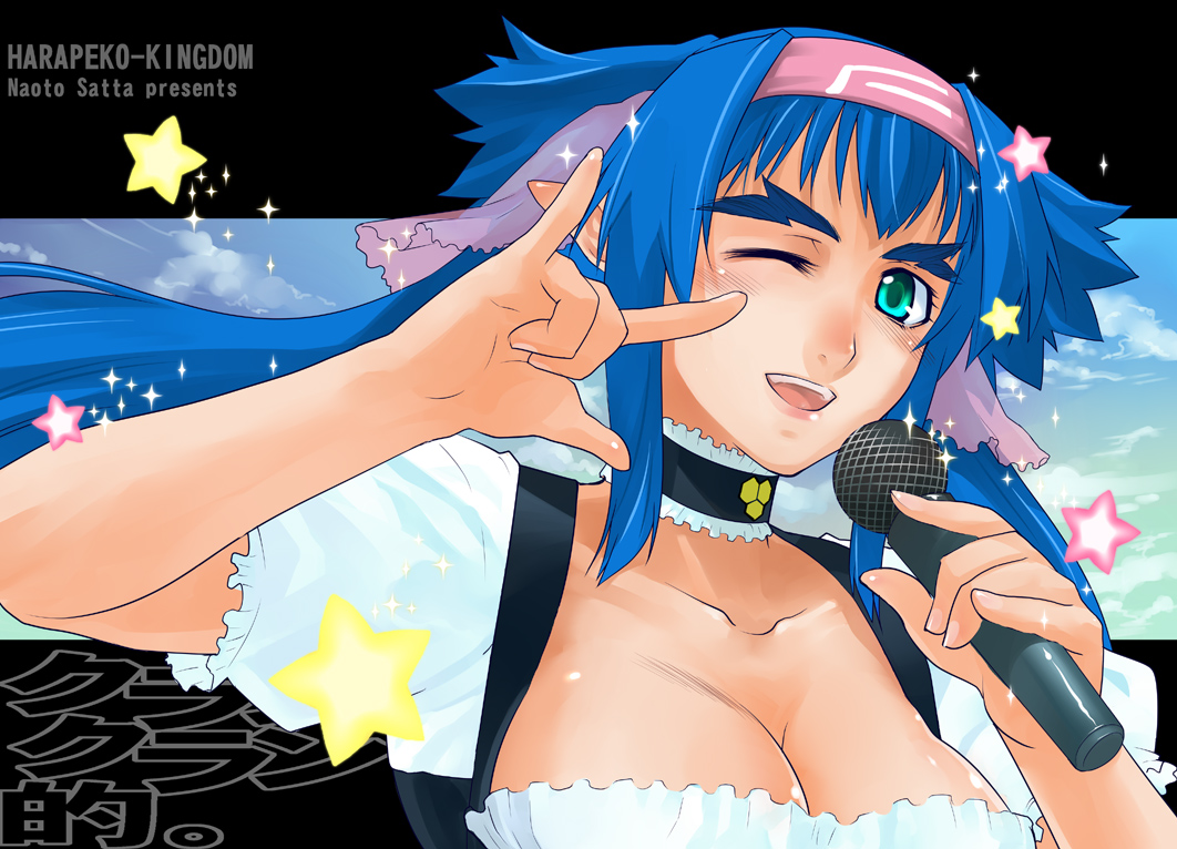 1girlblue hairbreastscleavagefemale focusgreen eyesm/microphoneone eye closedparodypointy earss.m.s.seikan hikousolowink
