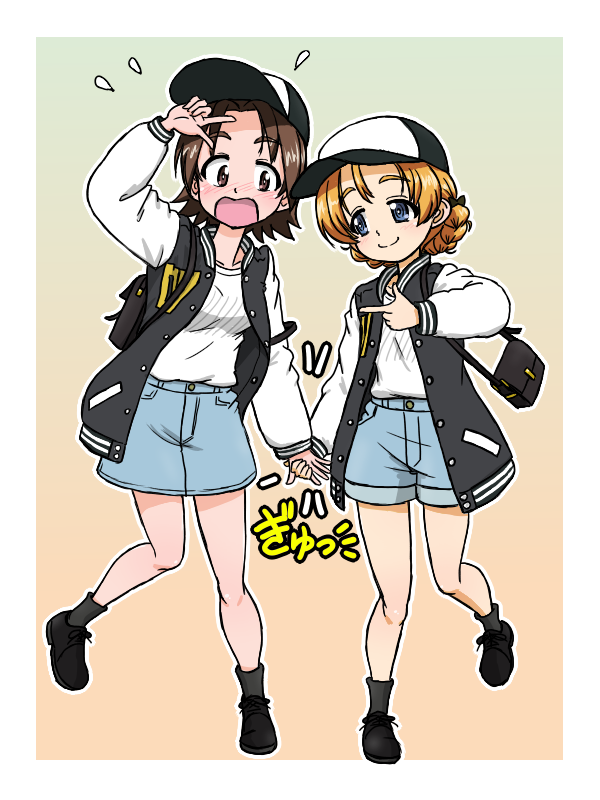 2girlsblue eyesblue shortsblushbraidbreastsbrown eyesbrown hairclosed mouthfull bodyhatholding handslooking at anotherminiskirtmultiple girlsopen mouthorange hairshort hairshortsskirtsmall breastssmileyuri