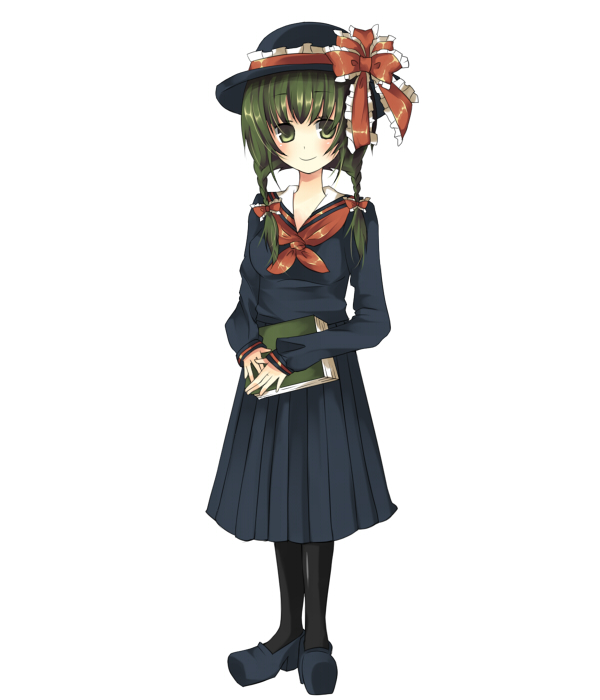 1girlalternate costumealternate hairstylebookbraidfemale focusgreen hairhatribbonschool uniformserafukusolotwin braidstwintailswhite background
