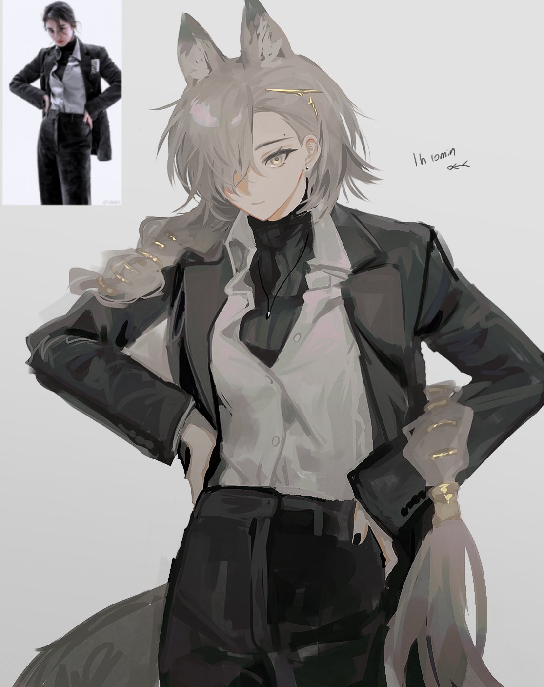 1girlanimal ear fluffanimal earsblack jacketblack nailsblack pantsblack suitblack sweaterbrown hairclosed mouthcollared shirtcowboyearringsextra earsfacing viewerformal clotheshair ornamenthair over one eyehands on own hipsinsetjacketjewelrylong hairlong sleeveslooking at viewermolemole above eyenail polishnecklaceone eye coveredpantspartially unbuttonedphoto insetreference insetribbed sweatershirtsimple backgroundsolostick figurestud earringssuitsuit jacketsweaterturtleneckturtleneck sweatervery long hairwesternwhite backgroundwhite shirtwolf earswolf girlyellow eyes