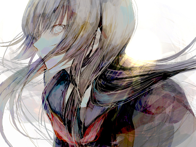 kei (keigarou), original, eyebrows, 1girl, black eyes, black hair, black serafuku, female focus, from side, glasses, long sleeves, railing, rimless eyewear, school uniform, serafuku, smile, solo, upper body
