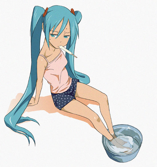 1girlalternate costumeaqua eyesaqua hairarm supportarms behind backbare shouldersbarefootbreastscamisoleeatingfemale focusfoodfrom abovefull bodyhair between eyeshair ornamenthalf-closed eyeslegslong hairlooking at viewermouth holdpolka dotpopsicleshadowshort shortsshortssimple backgroundsittingsmall breastssoaking feetsolosweattubtwintailsvery long hairwashbowlwaterwhite background