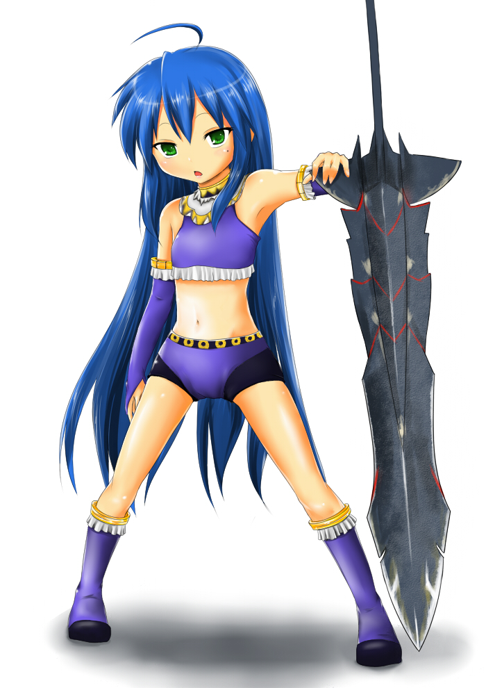 1girlblue hairbootscameltoecosplaydetached sleevesfemale focusflat chestgreen eyeshuge weaponmidriffmolemole under eyesoloswordweapon