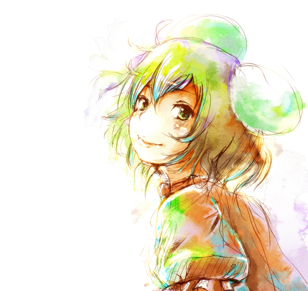 1girlanimal earsbrown eyesbrown hairdressfemale focuslooking at viewerorange dresspuffy short sleevespuffy sleevesrabbit earsshort sleevessimple backgroundsoloupper bodywhite background