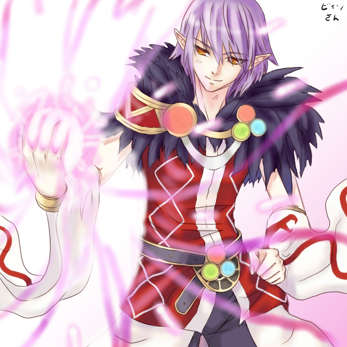1boybeltblack beltblack pantsclosed mouthcowboy shotdetached sleevesenergy ballfur collarhair between eyeslooking at viewermagicmale focusorange eyespantspink backgroundpointy earspurple hairred shirtshirtshort hairsleevelesssleeveless shirtsmilesolowhite sleeves