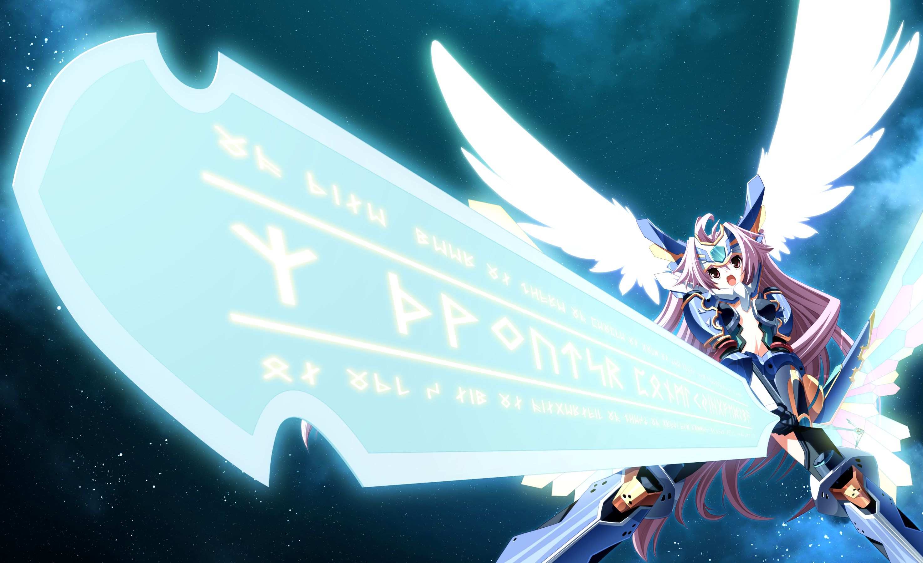 1girlarmorfemale focuslong hairpink hairred eyesrunessolostar (symbol)sunrise stanceswordvery long hairweaponwings