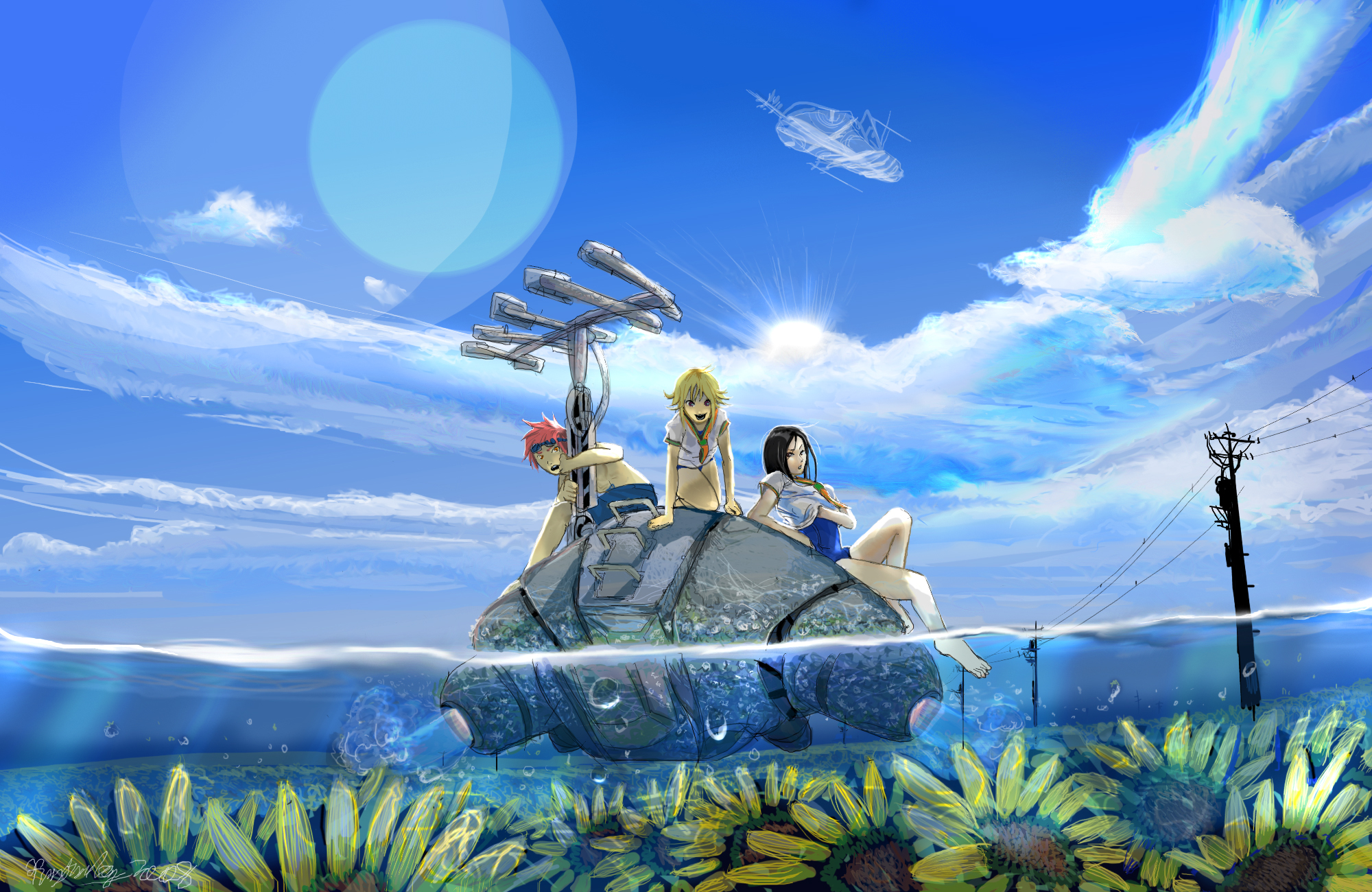 1boy2girlsantennaebarefootblack hairblonde hairclouddaygogglesmechamultiple girlsno pantsoceanone-piece swimsuitoutdoorspartially underwater shotrobotsceneryschool swimsuitschool uniformscience fictionserafukuskysunswimsuitswimsuit under clothesunderwater