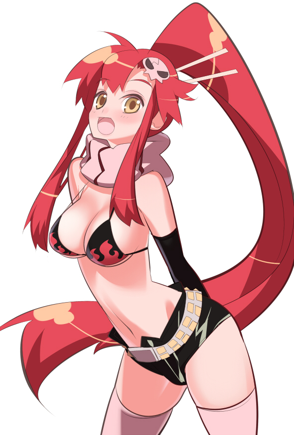 furude rika, hanyuu, houjou satoko, higurashi no naku koro ni, higurashi no naku koro ni gou, black hairband, blonde hair, blue hair, blunt bangs, blush, breast envy, breasts, hairband, hakama, hakama skirt, hime cut, horns, japanese clothes, miko, multiple girls, purple eyes, purple hair, red eyes, red hakama, short hair, sideboob, skirt, speech bubble, tight clothes, white background
