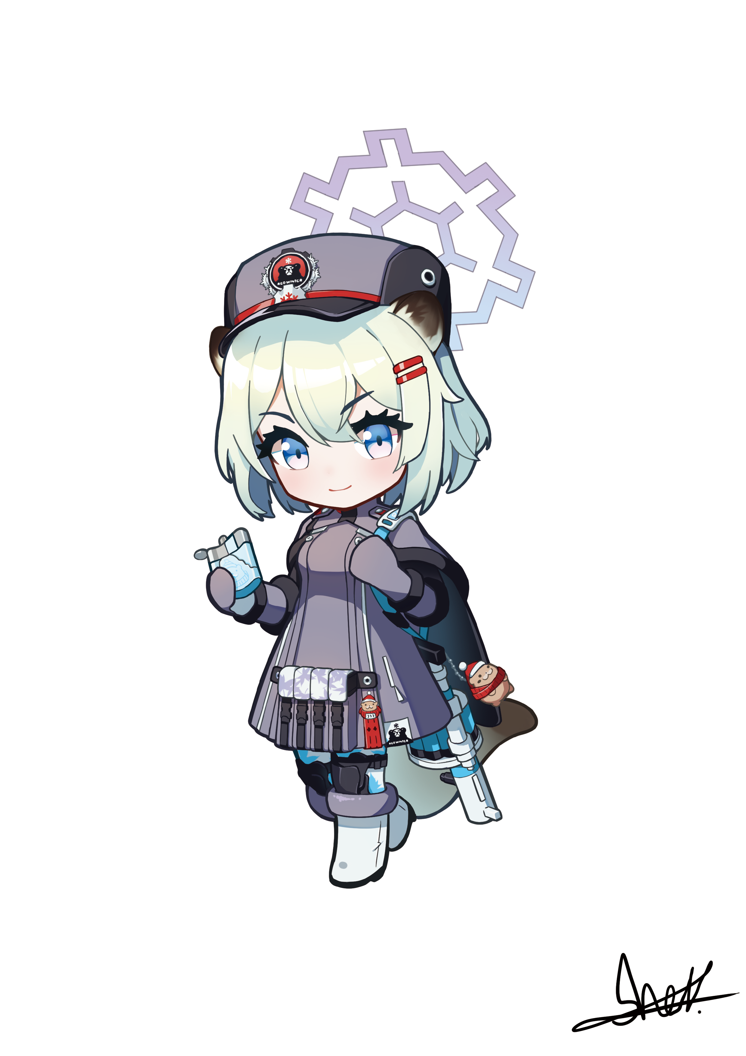1girlanimal earsblue eyesbootscapeletchibiclosed mouthdressflat capfull bodyfur trimfur-trimmed bootsgreen hairgrenade launchergrey capeletgrey dressgrey hatgrey mittenshair between eyeshair ornamenthaircliphalohathip flaskholdingknee bootsknee padslong sleeveslooking at viewermittensrg-6signaturesimple backgroundsmilesolotailwalkingweaponweasel earsweasel girlweasel tailwhite backgroundwhite boots
