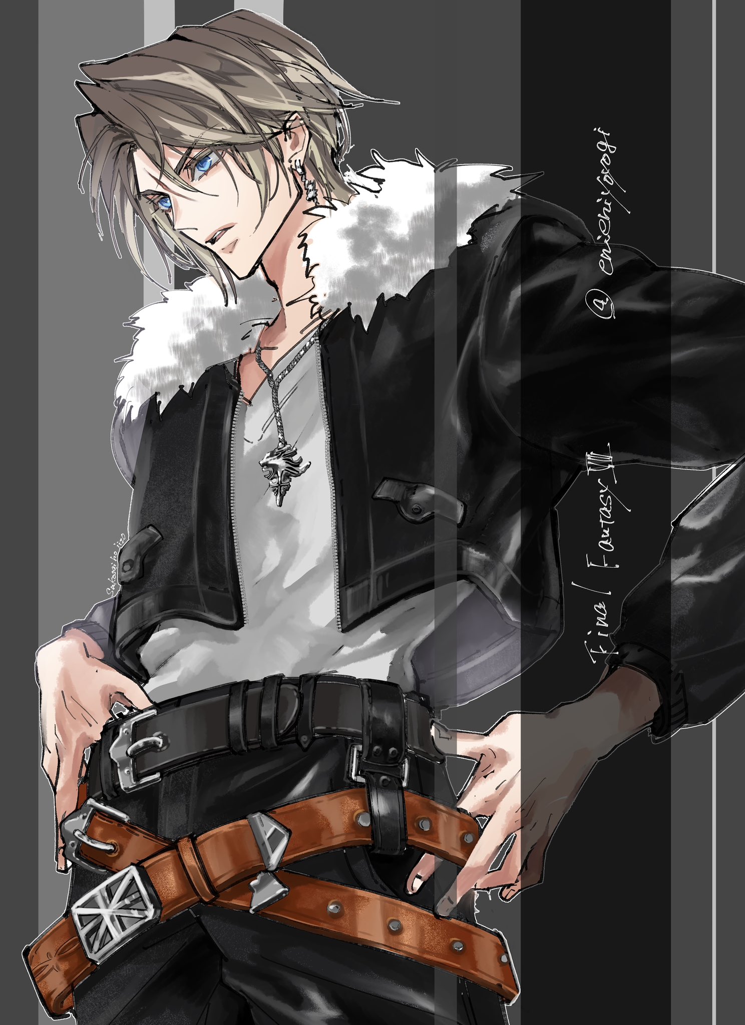 1boybeltbelt buckleblack beltblack jacketblack pantsblue eyesbrown beltbrown hairbucklechainchain necklacecopyright namecowboy shotcropped jacketcrossed beltsearringsfur trimfur-trimmed jacketgrey backgroundhair between eyeshands on own hipsjacketjewelryleatherleather jacketmale focusmultiple beltsnecklacepantsparted bangsparted lipsscarscar on facescar on foreheadshirtshort hairsingle earringsolotwitter usernamewhite shirt