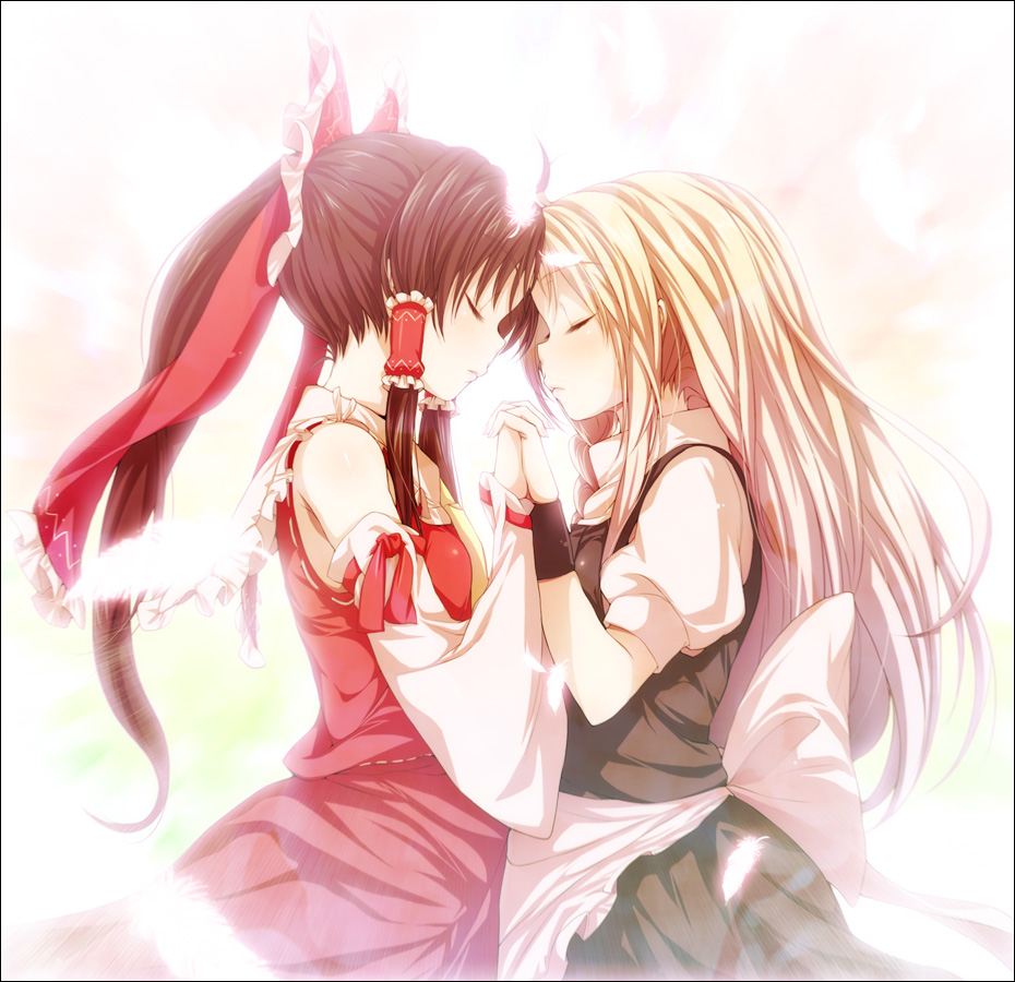 2girlsblack hairblonde hairclosed eyesface-to-facefeathersfemale focusflat chestforehead-to-foreheadheads togetherholding handslong hairmultiple girlsponytailyuri