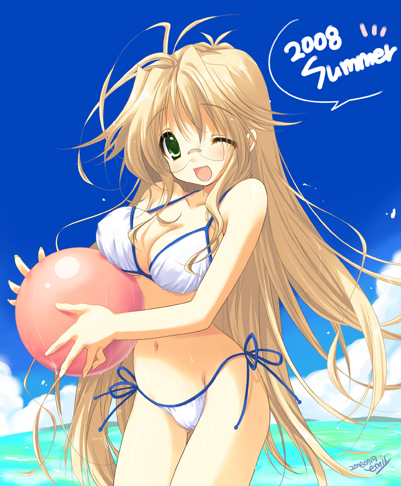 1girlballbikiniblonde hairbreastscleavagedayfemale focusglassglassesgreen eyeslarge breastslong hairone eye closedside-tie bikini bottomsoloswimsuitthigh gapthighsvery long hairwhite bikiniwink