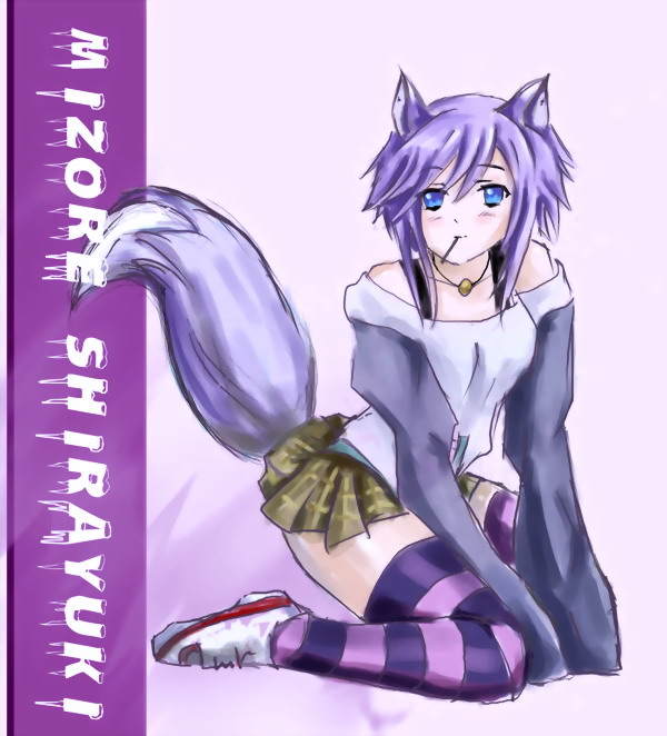 00s1girlanimal earsblue eyesfemale focusfoxfox earsfox tailjewelrylong sleevesnecklacepurple hairshort hairskirtsockssolostriped clothesstriped socksstriped thighhighstailthighhighs