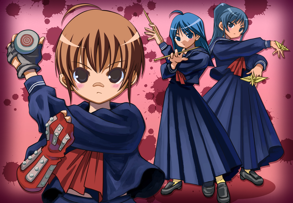 3girlsahogebandaidbandaid on facebandaid on noseblue hairbrown hairdelinquentdrumstickslong skirtmultiple girlsorigamipaper craneponytailschool uniformserafukuskirtsukeban