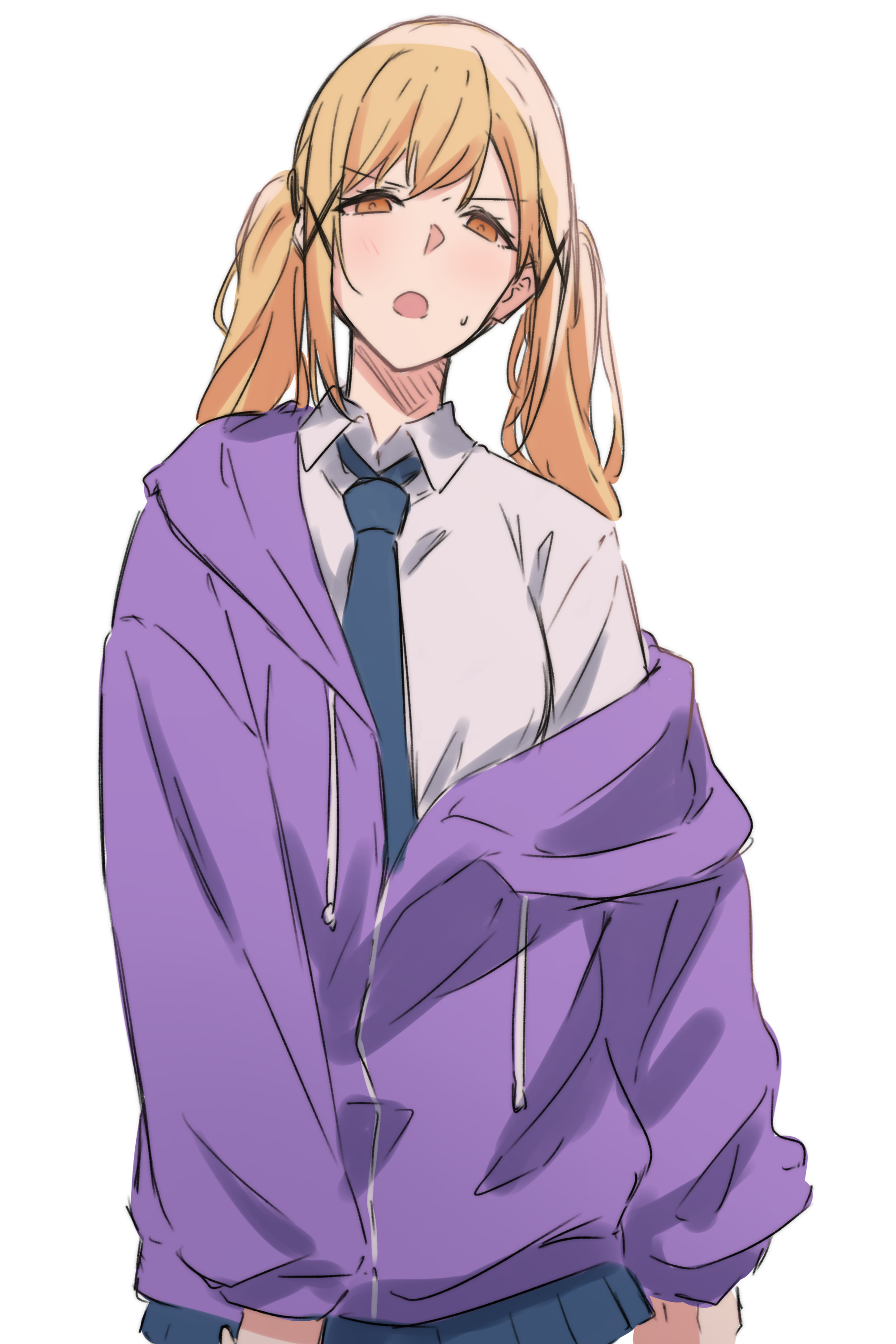 1girlblonde hairblue necktieblue skirtblushbrown eyescollared shirthair ornamentjacketlong hairlong sleevesnecktieopen clothesopen jacketopen mouthpurple jacketshirtsidelockssimple backgroundsingle off shoulderskirtsolosweatdroptwintailswhite backgroundwhite shirtx hair ornament