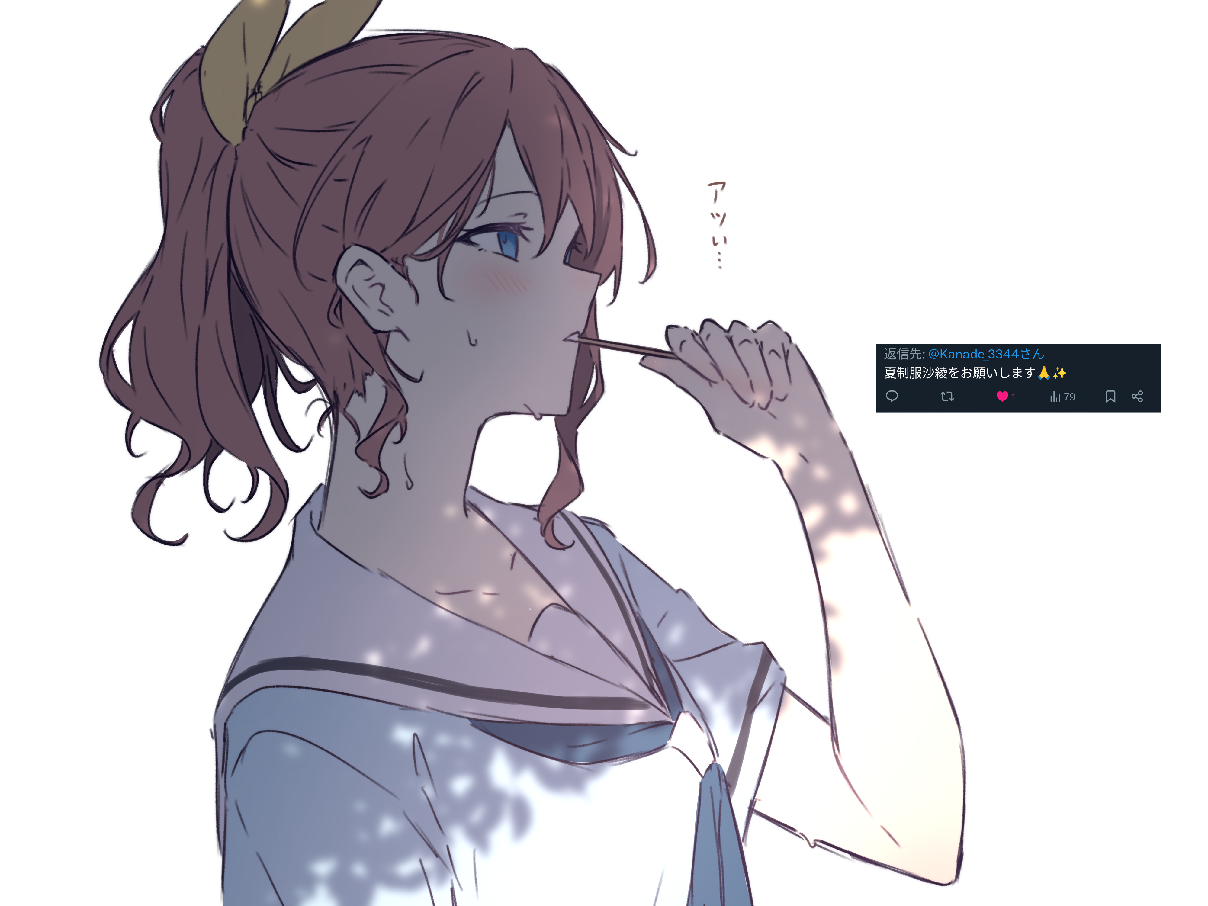 1girlblue eyesblue neckerchiefblue shirtbrown hairhanasakigawa school uniformmedium hairneckerchiefopen mouthponytailrequest insetschool uniformserafukushadeshirtshort sleevessimple backgroundsolosweatupper bodywavy hairwhite background