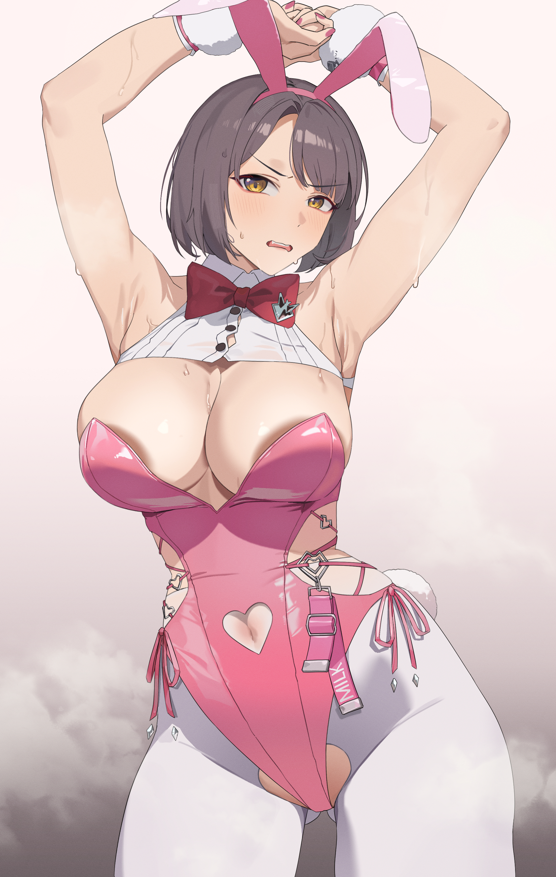 1girlanimal ear hairbandanimal earsarmpitsarms upblack hairblushbowbowtiebreastscleavageclothing cutoutfake animal earsgluteal foldhairbandlarge breastsleotardlooking at viewernavel cutoutofficial alternate costumepantyhosepink leotardplayboy bunnyrabbit ear hairbandrabbit earsshort hairside-tie leotardsolosweatundersized breast cupwhite pantyhoseyellow eyes