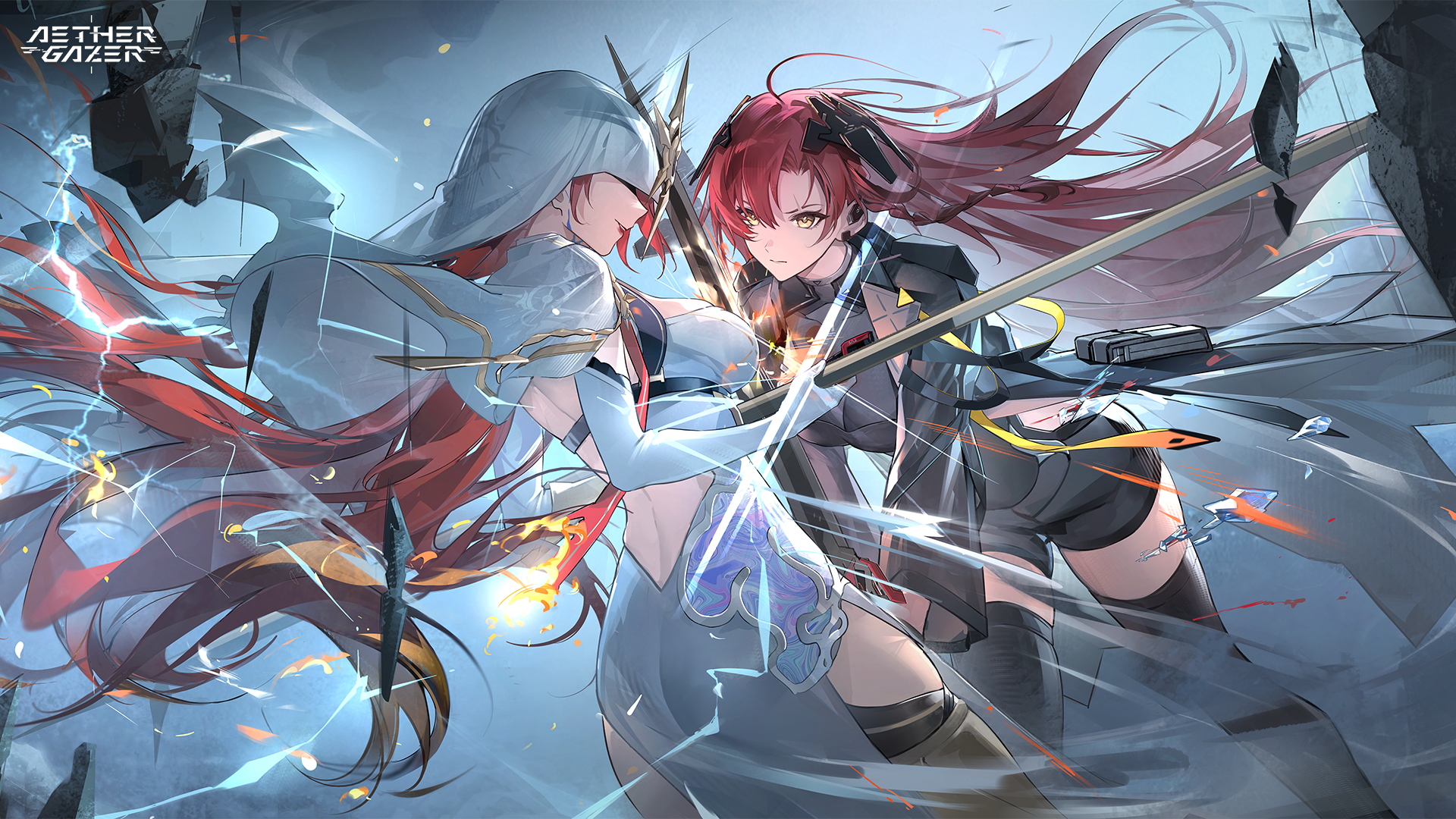 2girlsblack thighhighsclosed mouthcopyright namedresselbow glovesglovesholdingholding swordholding weaponlong hairlong sleevesmedian furrowmultiple girlspouchred hairred lipssee-through cleavagesee-through clothesswordsword clashthighhighsweaponwhite dresswhite gloveswhite hoodyellow eyes