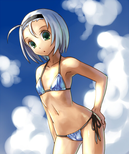 1girlbikiniblue bikiniblue haircameltoecloudcowboy shotdayfemale focusflat chestgreen eyeshairbandnavelshort hairside-tie bikini bottomskysoloswimsuit