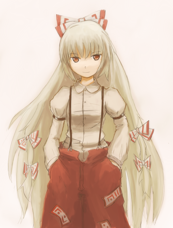 1girlfemale focushair ribbonhands in pocketslong hairred eyesribbonsolosuspendersvery long hair