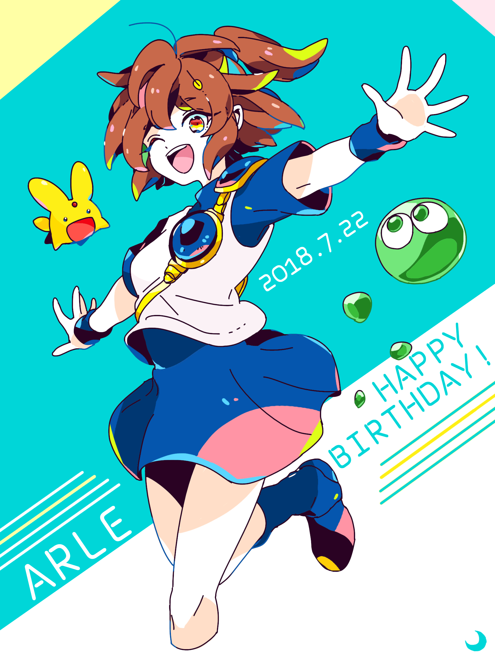 1girlahogearmorblue backgroundblue shoesblue skirtblue sleevesbootsbreastplatebrown eyesbrown haircharacter namedatedenglish textfloating clothesfloating hairfoot out of framehair between eyesmessy hairone eye closedopen mouthoutstretched armspleated skirtponytailshirtshoesshort hairshort sleevesshoulder armorskirtsteppingteethupper teeth onlywhite backgroundwhite shirtwristband