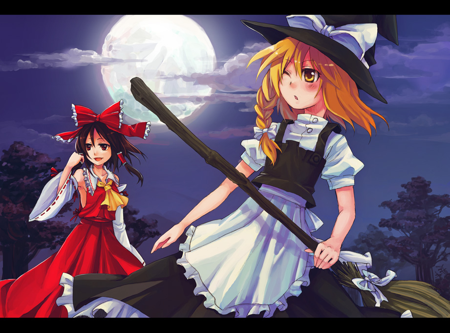 2girlsblonde hairbroomdetached sleevesfemale focusfull moonhatjapanese clothesletterboxedlong hairmikomoonmultiple girlsnightone eye closedred eyesribbonwinkwitchwitch hatyellow eyes
