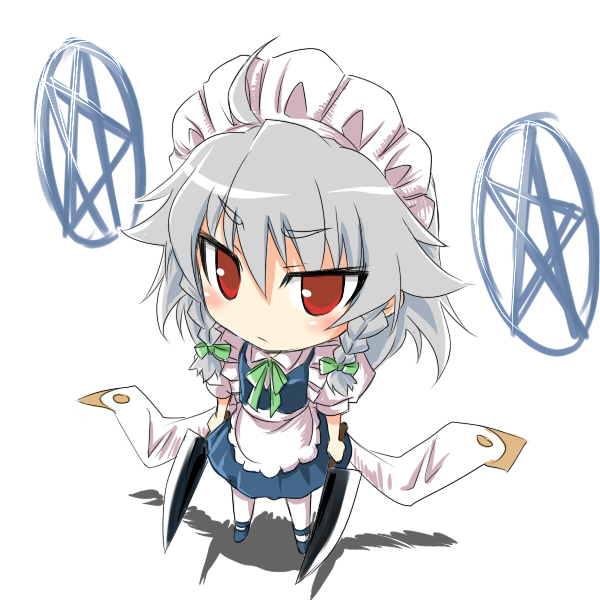 1girlblushbraidchibifemale focusknifemagic circlemaidpentagramribbonshort hairsolothrowing knifetwin braidstwintailsweapon