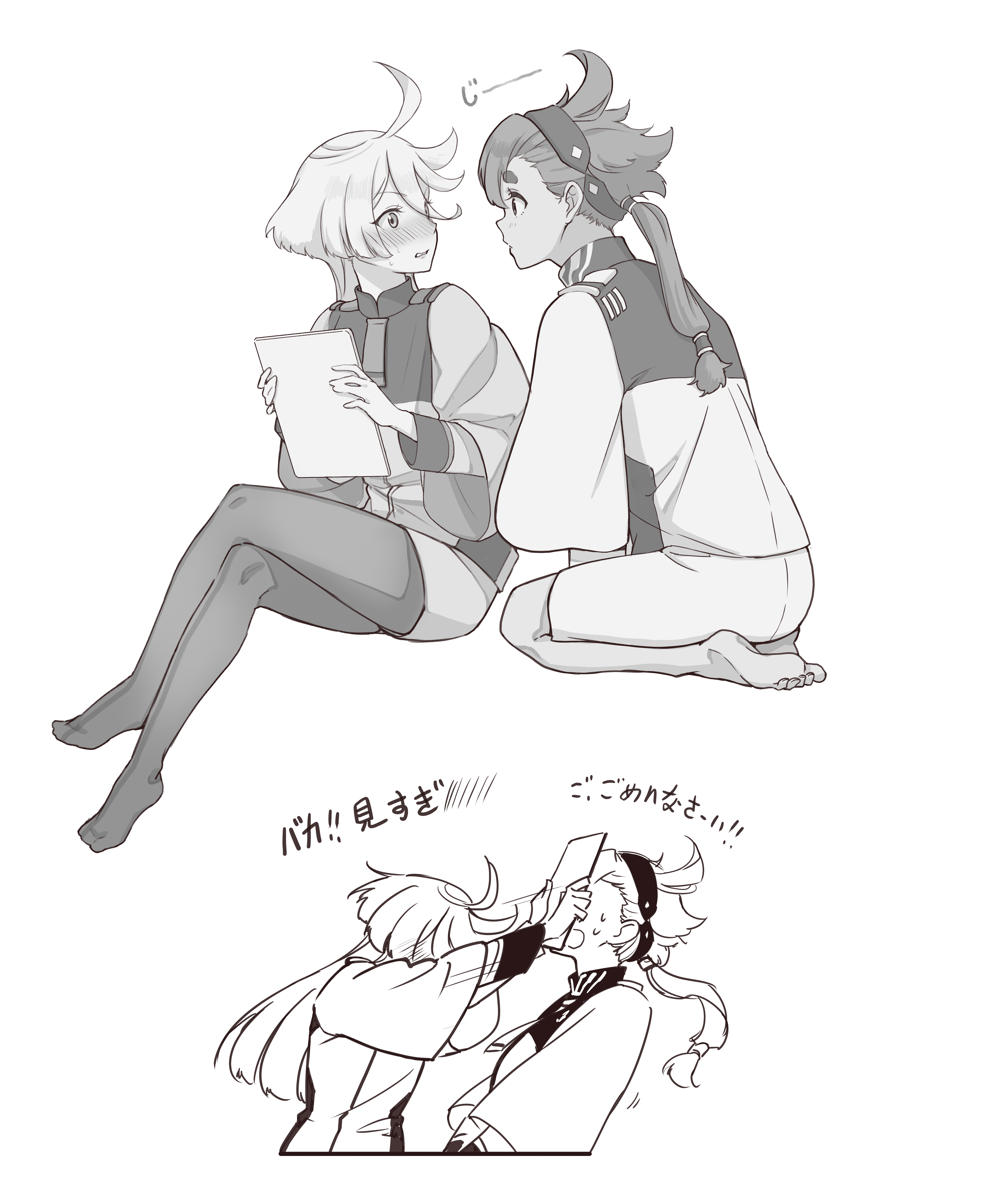 2girlsahogeasticassia school uniformbarefootblushcrossed legsembarrassedeye contactfeethairbandholdingholding tablet pclong hairlooking at anothermonochromemultiple girlsno shoespantyhoseponytailschool uniformseizasimple backgroundsittingsolesstaringtablet pctoeswhite backgroundyuri