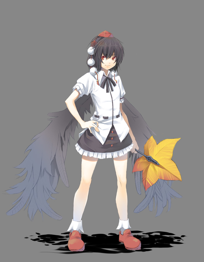 1girlblack hairblack wingsfemale focusfull bodyhand fanhatlegsred eyesribbonshort hairskirtsolowings