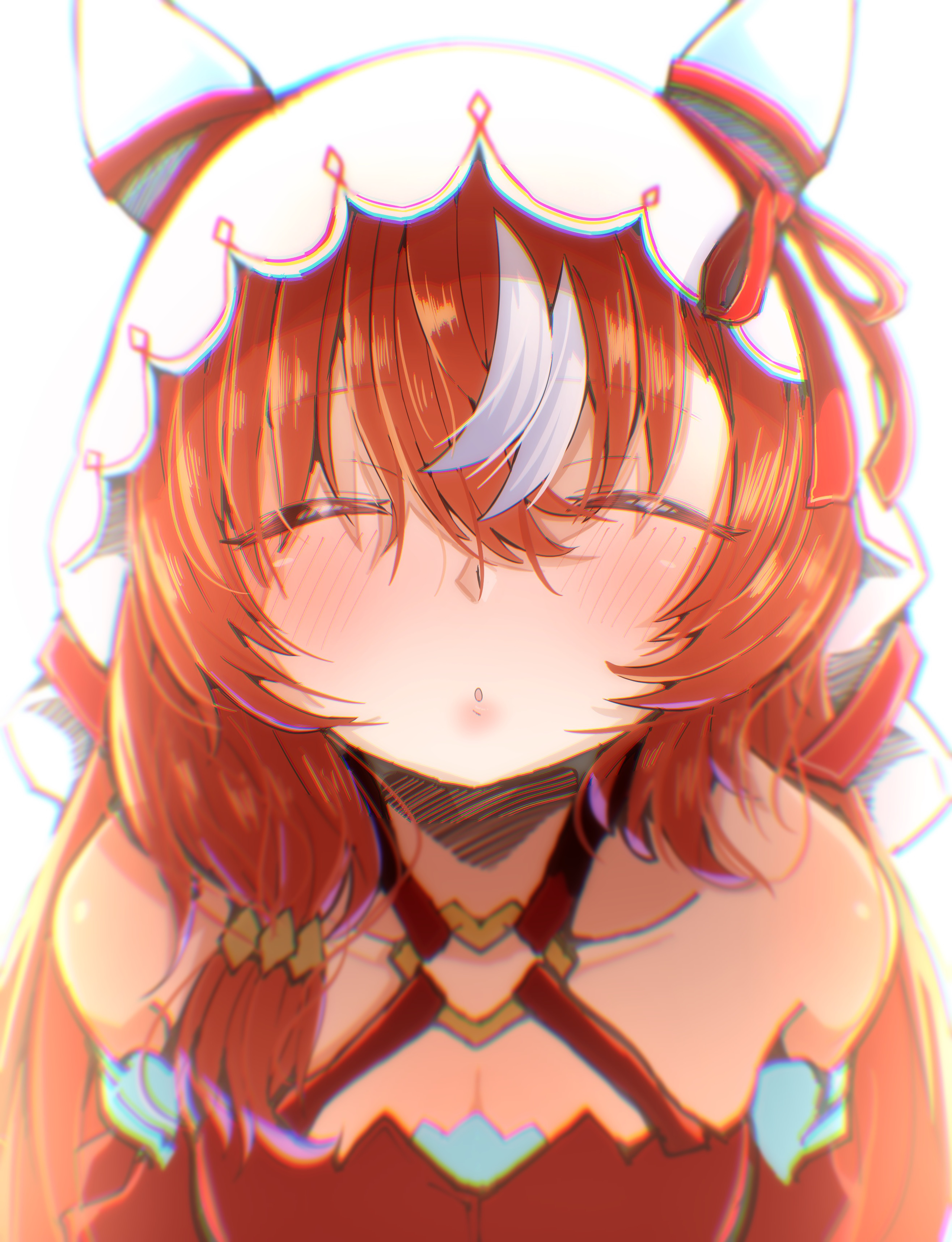 1girlanimal earsblurryblurry backgroundblushbreastscleavageclosed eyescollarbonedetached sleeveshair between eyeshair ornamenthorse girlimminent kisslong hairlooking at viewermatsumotograndeportraitpovsmall breastssoloveilwhite background