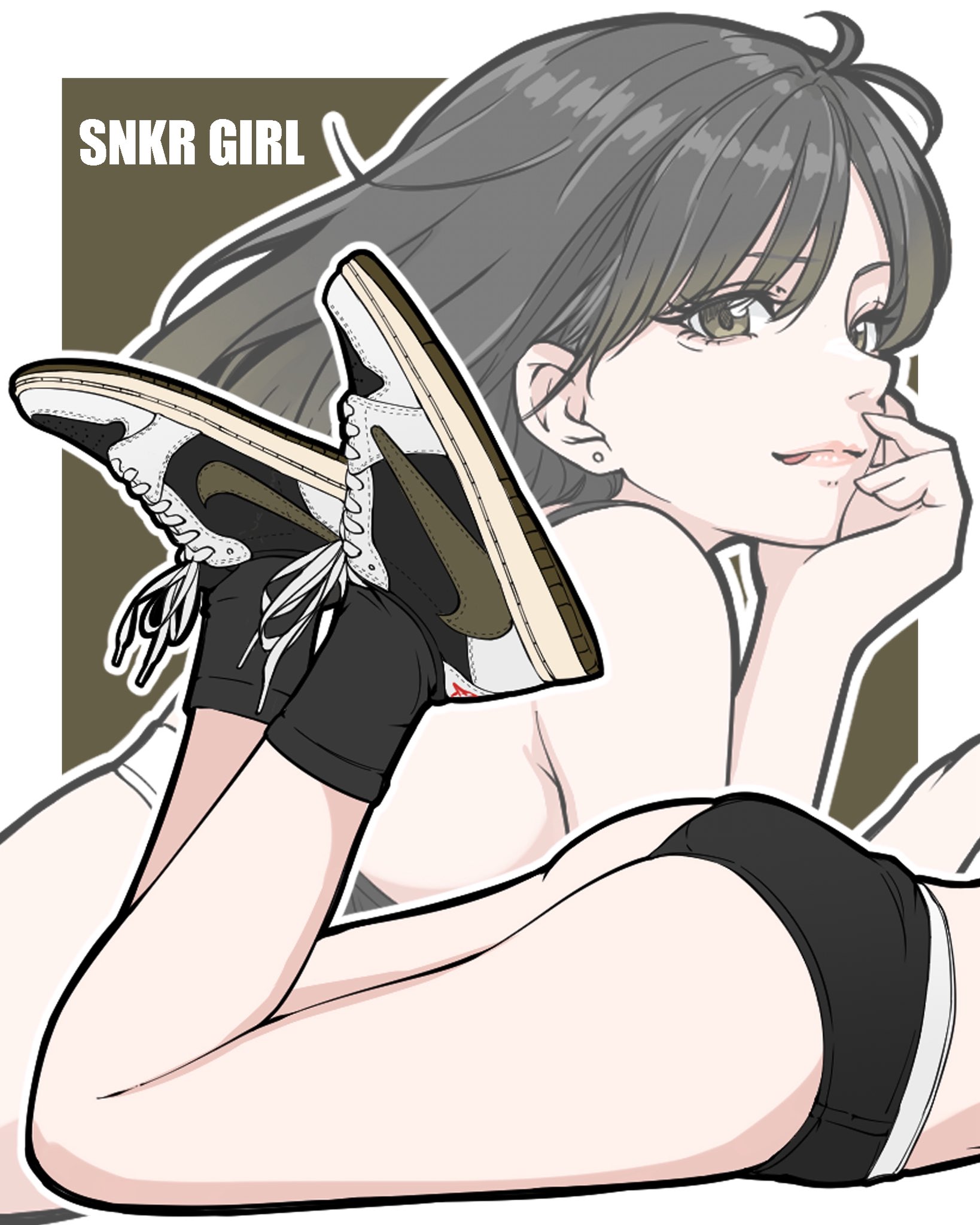 1girlassblack hairblack pantiesblack socksbrown backgroundclosed mouthfrom sidelong hairlooking at viewerlyingon stomachpantiesshoessimple backgroundsneakerssockssolotwo-tone backgroundunderwearwhite background