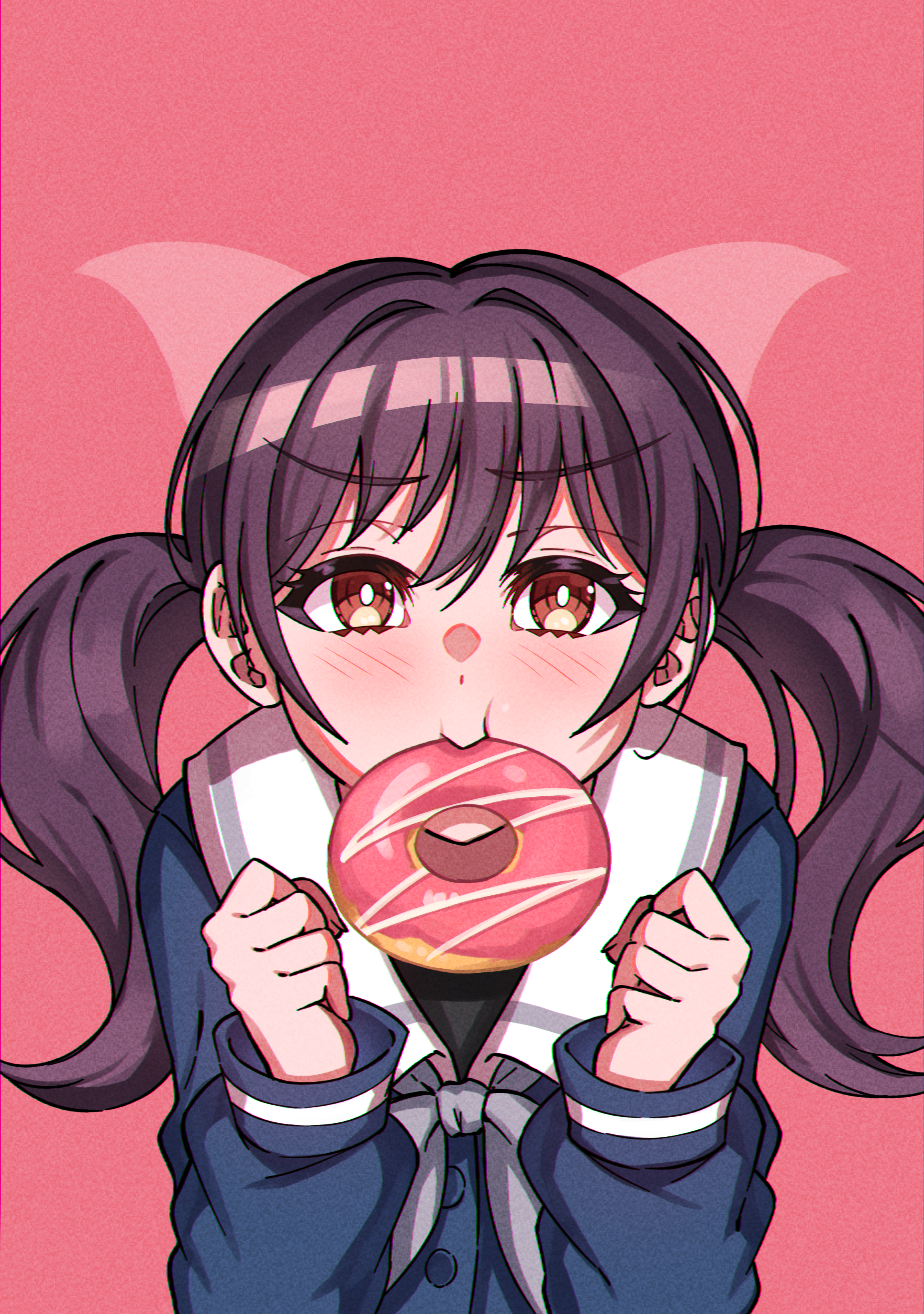 1girlblack hairblue shirtblushbrown eyesdonutfoodfood in mouthgrey neckerchiefhands uplong hairlong sleeveslooking at viewermouth holdneckerchiefpink backgroundschool uniformshirtsolotsukinomori school uniformtwintailsupper body