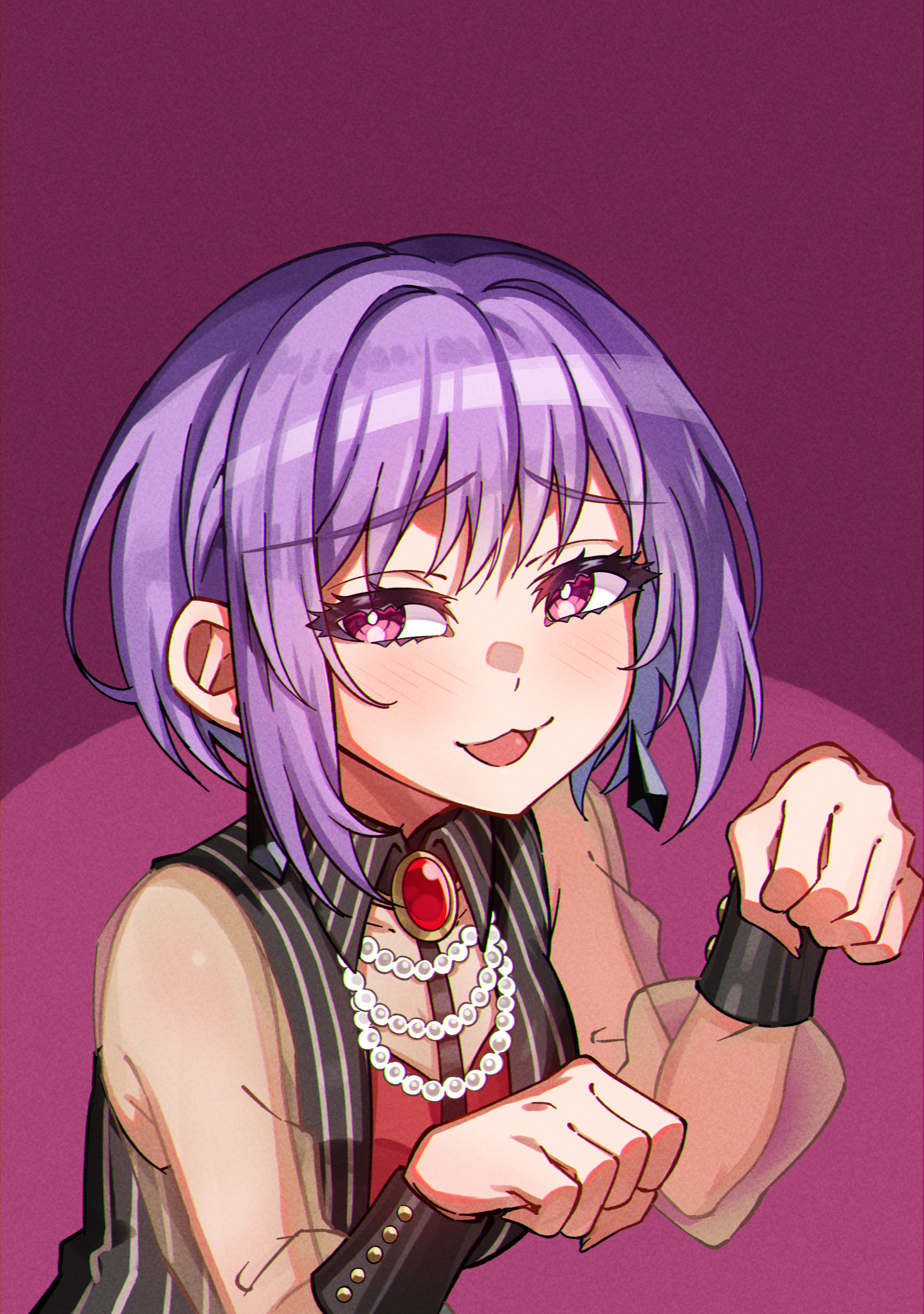 :31girlbead necklacebeadsblushjewelrylong sleeveslooking at viewernecklaceopen mouthpaw posepink backgroundpink eyespurple hairred broochsee-through clothessee-through sleevesshort hairsidelockssoloupper body