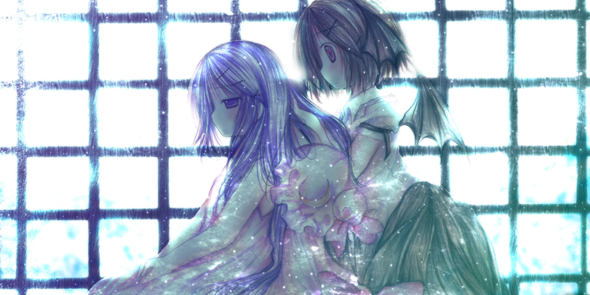 2girlsbare shouldersbat wingsbrown haircrescentfemale focusfrom sidehair ornamenthaircliphathead wingsmob capmultiple girlspurple eyespurple hairred eyessliding doorswingsx hair ornament