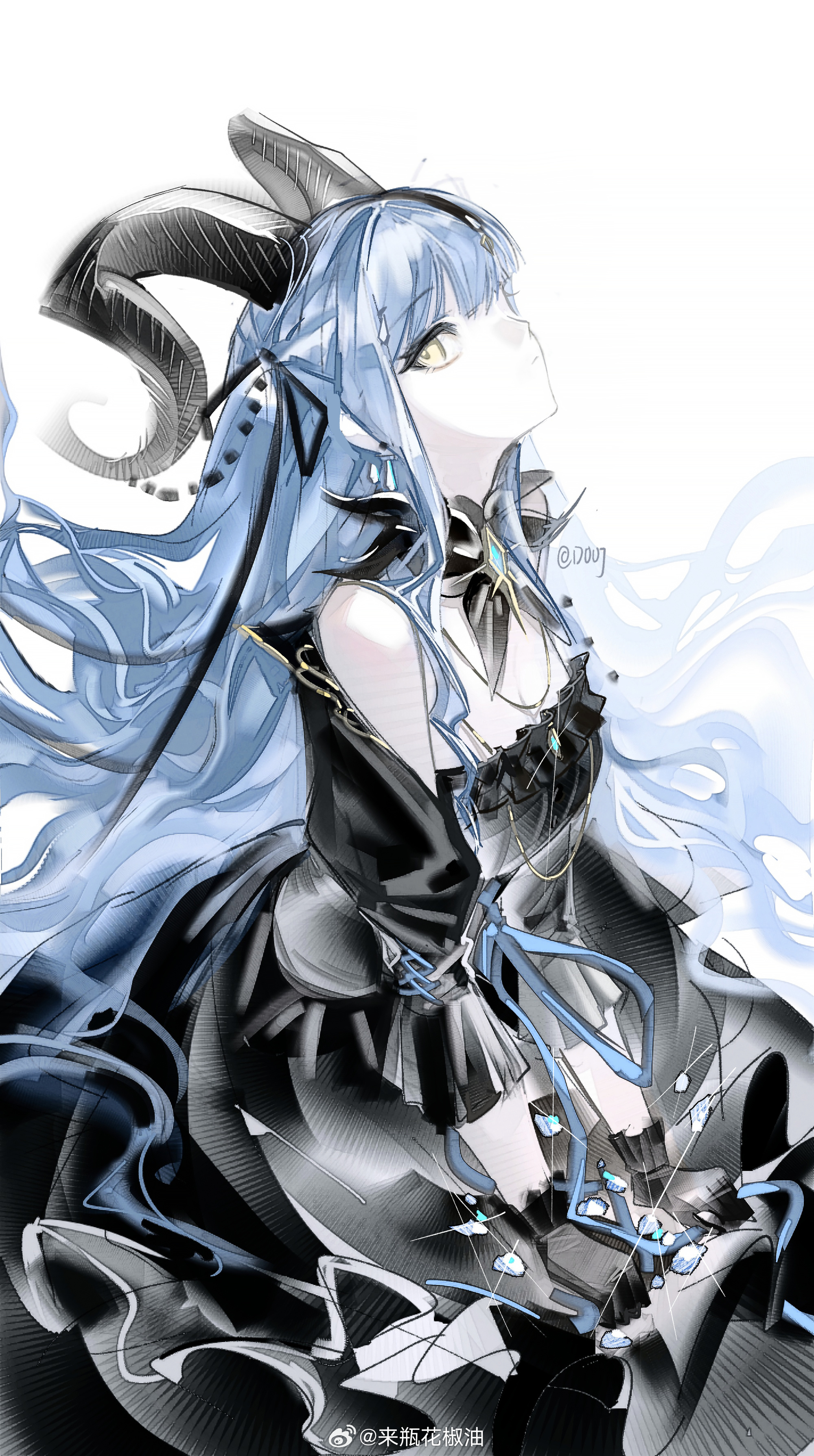 1girlblack dressblack glovesblack hornsblack ribbonblue hairbreastscleavageclosed mouthcowboy shotcurled hornsdetached collardressgloveshair ribbonhornsjewelrylong hairlooking at viewernecklaceribbonsidelockssimple backgroundsolotwo side upwatermarkweibo watermarkwhite backgroundyellow eyes